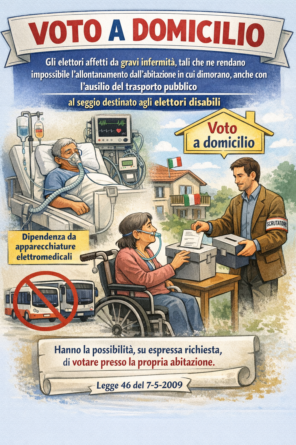 VOTO A DOMICILIO:Gli elettori affetti da gravi infermità, tali che ne rendano impossibile l'allontanamento dall'abitazione in cui dimorano, anche con l'ausilio del trasporto pubblico al seggio destinato agli elettori disabili (condizioni di dipendenza continuativa e vitale da apparecchiature elettromedicali), hanno la possibilità, su espressa richiesta, di votare presso la propria abitazione (legge 46 del 7-5-2009).